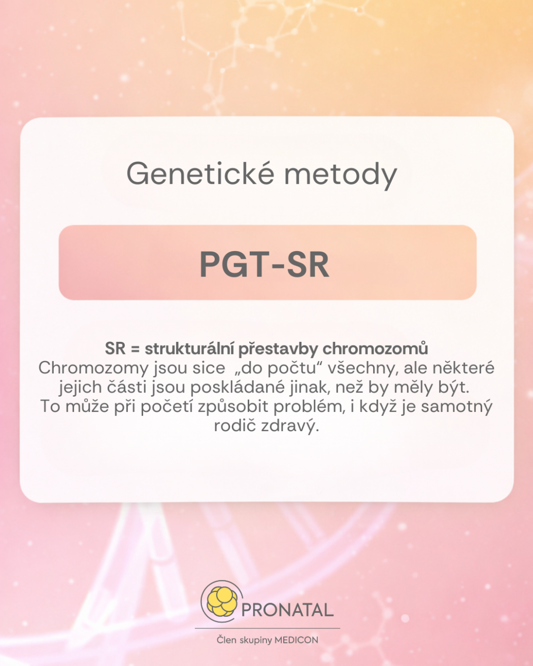 PGT-SR je určeno pro páry s chromozomální přestavbou. Tyto genetické změny často způsobují opakované potraty nebo neúspěšné transfery. Vyšetření pomáhá vybrat embryo s geneticky správnou strukturou.