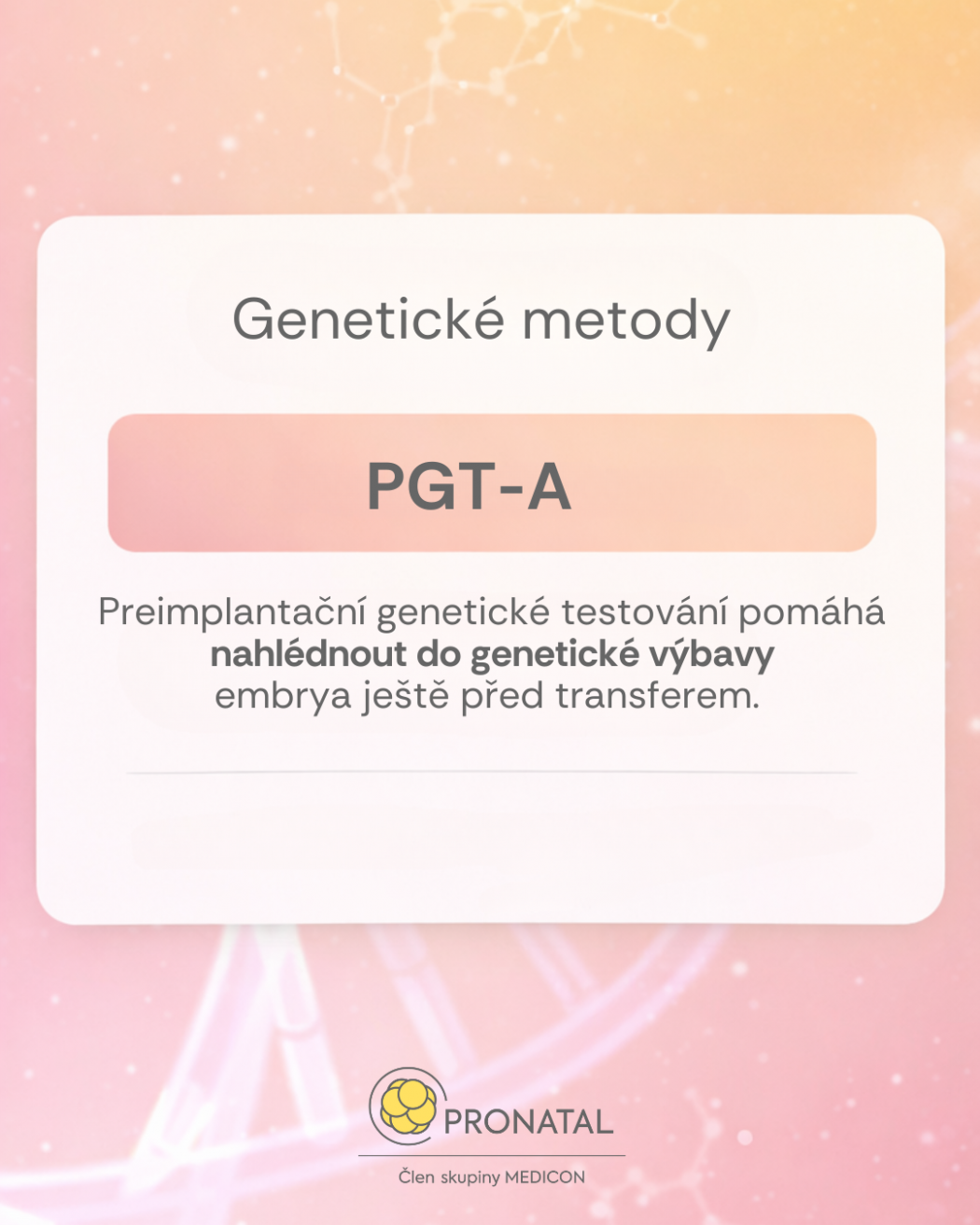 PGT dnes patří mezi nejdůležitější vyšetření v IVF, protože jako jediné dokáže odhalit genetickou kvalitu embrya ještě před jeho přenosem do dělohy. A právě genetika je v mnoha případech tím neviditelným důvodem, proč se těhotenství nedaří.